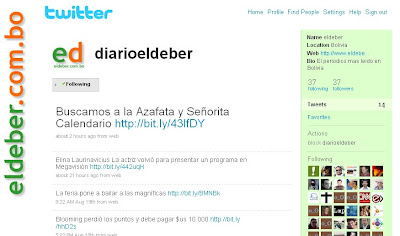 La cuenta Twitter del diario cruceño El Deber cumple hoy su primera semana, y desde su inauguración, el 13 de agosto de 2009, ha publicado 14 “entradas”, sigue a 37 twiteros y lo siguen otros 37. Con seguridad, esta cifra irá subiendo según se conozca la buena noticia.