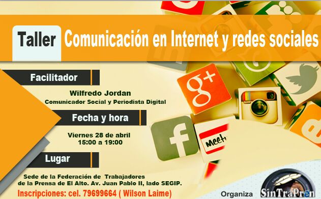 Gracias al Sindicato en Medios Escritos, Fotoperiodistas y Medios Digitales (SINTRAPREN) de El Alto, el viernes 28 de abril de 2017 impartiré el taller: Comunicación en Internet y redes sociales, dirigido a todos los profesionales y estudiantes que de una u otra manera desarrollan su actividad en unidades de comunicación y afrontan retos digitales.